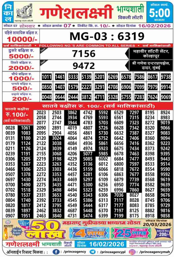 Maharashtra State Ganeshlaxmi Bhagyashali Weekly Lottery ticket is only Maharashtra Weekly rupees 10 for 1 ticket, but 10 thousand is given as prize for winning the major. Results are also placed on this page which you can see Ganeshlaxmi Bhagyashali Weekly Lottery Result today 16.2.2026 is searched by different names, Maharashtra State Ganeshlaxmi Bhagyashali Weekly Lottery Result 05:00pm, Maharashtra State lottery 05:00pm result , Maharashtra State Lottery today Ganeshlaxmi Bhagyashali Weekly lottery result, Maharashtra Ganeshlaxmi Bhagyashali Lottery Result, Maharashtra State Ganeshlaxmi Bhagyashali Weekly lottery result 2025, Ganeshlaxmi Bhagyashali Weekly lottery result 05:00pm, Maharashtra State lottery 2025.