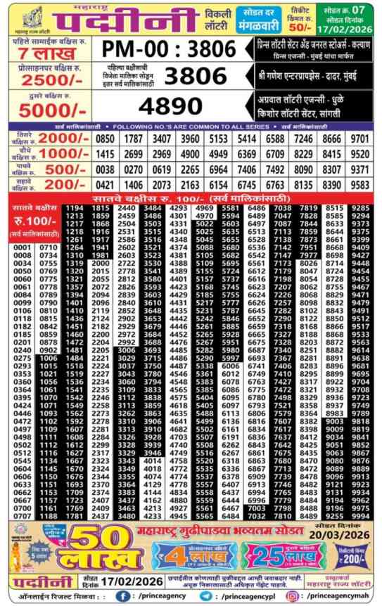 Maharashtra State Lottery declares many bumper results. Maharashtra Padmini 2026 Result is Maharashtra State Lottery at 04:15 PM whose result gets published on the page around 05:00 PM. Maharashtra State Padmini Weekly Lottery Result 17.2.2026 Live Draw Winner List at 4.15 PM, Maharashtra Dear Padmini Lottery 2026, Today Maharashtra Padmini Lottery, Maharashtra State Lottery Padmini Lottery Result Today Live, Maharashtra Padmini Draw 2026, Maharashtra Lottery Padmini Result 2026, Maharashtra Lottery 2026, Maharashtra State Lottery Result 2026, Maharashtra Padmini Lottery 17.2.2026 Result.