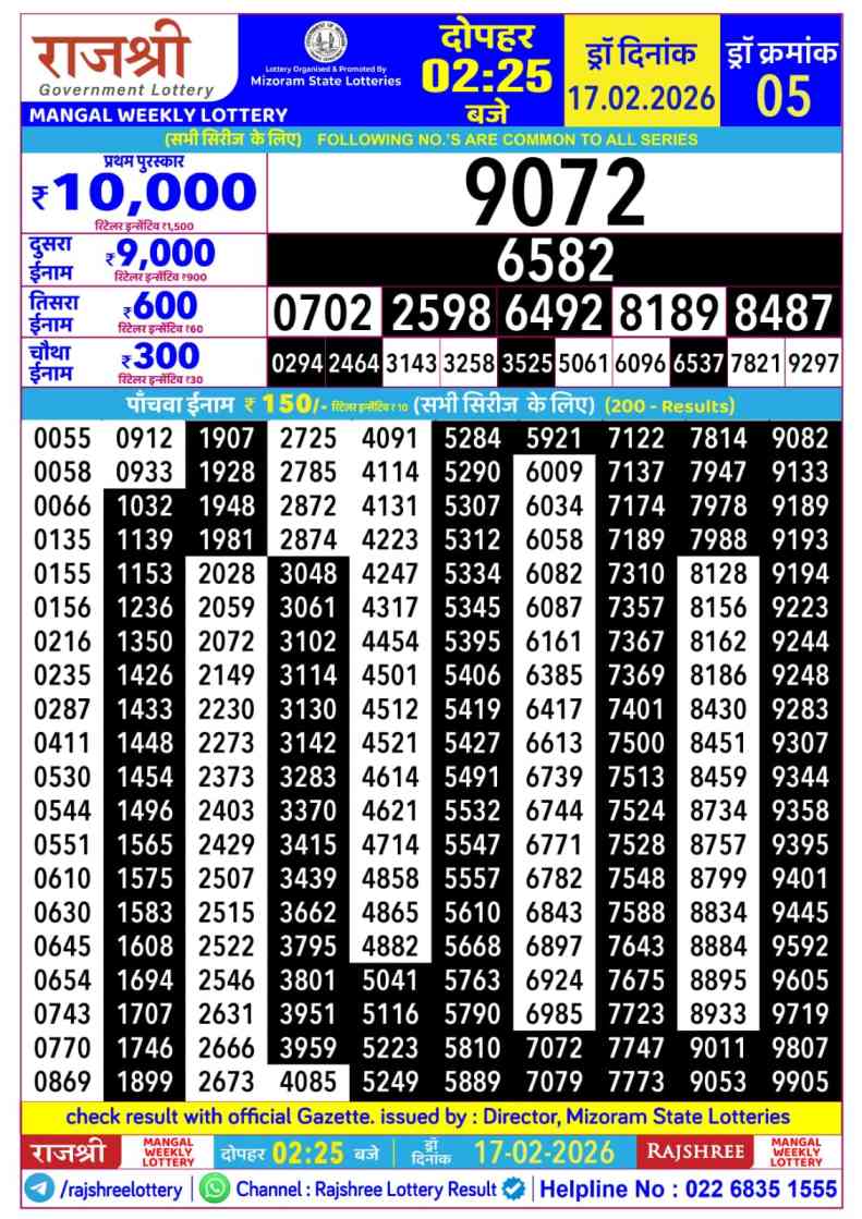 | Mizoram Rajshree Mangal Weekly Lottery Result Today Live 17.2.2026 | |
