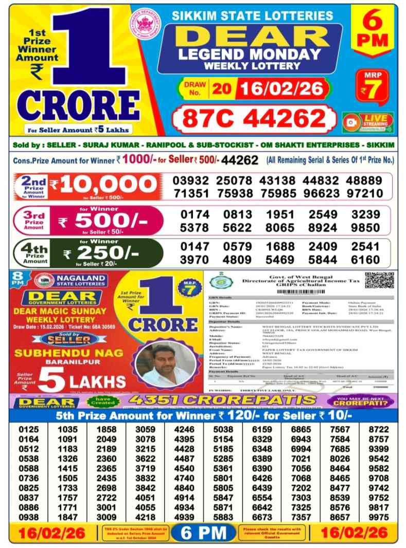 Sikkim State Lottery 17.2.2026 Today Result is weekly lottery draw whose lottery result is published thrice a day. Mainly Nagaland State Lottery is 8pm, 1pm, 6pm Nagaland State Lottery but being combined with lottery sambad 17.2.2026, Sikkim State Lottery, Nagaland State Lottery will release the results of 1pm, 6pm, 8pm. is published.