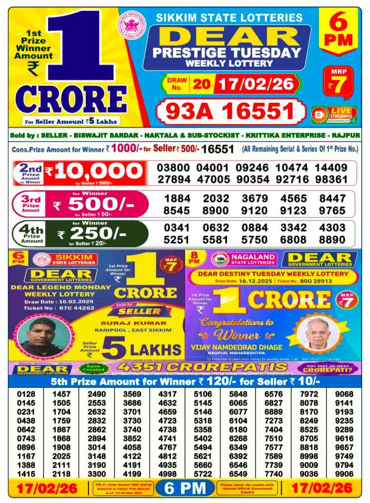 As per the official information provided by the Nagaland State Lotteries, 18.2.2026 Results the winner of today’s Dear First Winner award will receive INR 1 Crore from a ticket worth INR 6. You can check your result from the lotterysambad 18 2 26 link given below…