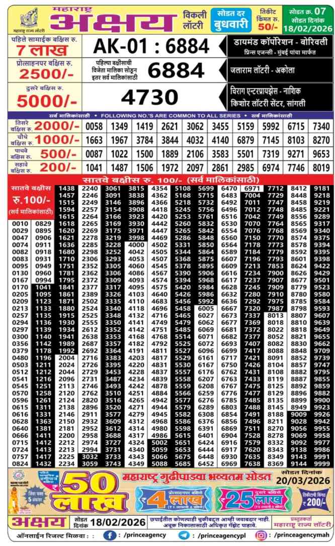 Maharashtra State Akshay lottery ticket is only 50 rupees for 1 ticket, but 8,00,000 Rupees is given as prize for winning the major. Results are also placed on this page which you can see Maharashtra Akshayr Result Today 18.2.2026 is searched by different names, Maharashtra State Akshay Weekly 2026, Maharashtra Akshay Weekly Lottery Result 2026, Maharashtra Akshay Lottery Result 18.2.2026 Live Result 4:15 PM, Maharashtra Akshay Lottery Result 18.2.2026, Dear Maharashtra Akshay PDF Result, Today Live Maharashtra Akshay Weekly Lottery Result, Maharashtra State Akshay Weekly 2026 Draw, Maharashtra State Akshay Weekly 2026 Result.