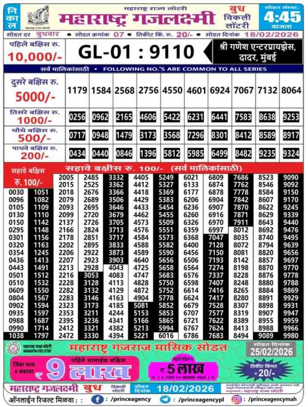 Maharashtra Gajlaxmi Budh Weekly Lottery Result Today Latest Update on 18 February 2026 : -Maharashtra State Lottery’s Gajlaxmi Budh Weekly Weekly Lottery Results have been declared today on Maharashtra Gajlaxmi Budh Weekly 4:45PM.