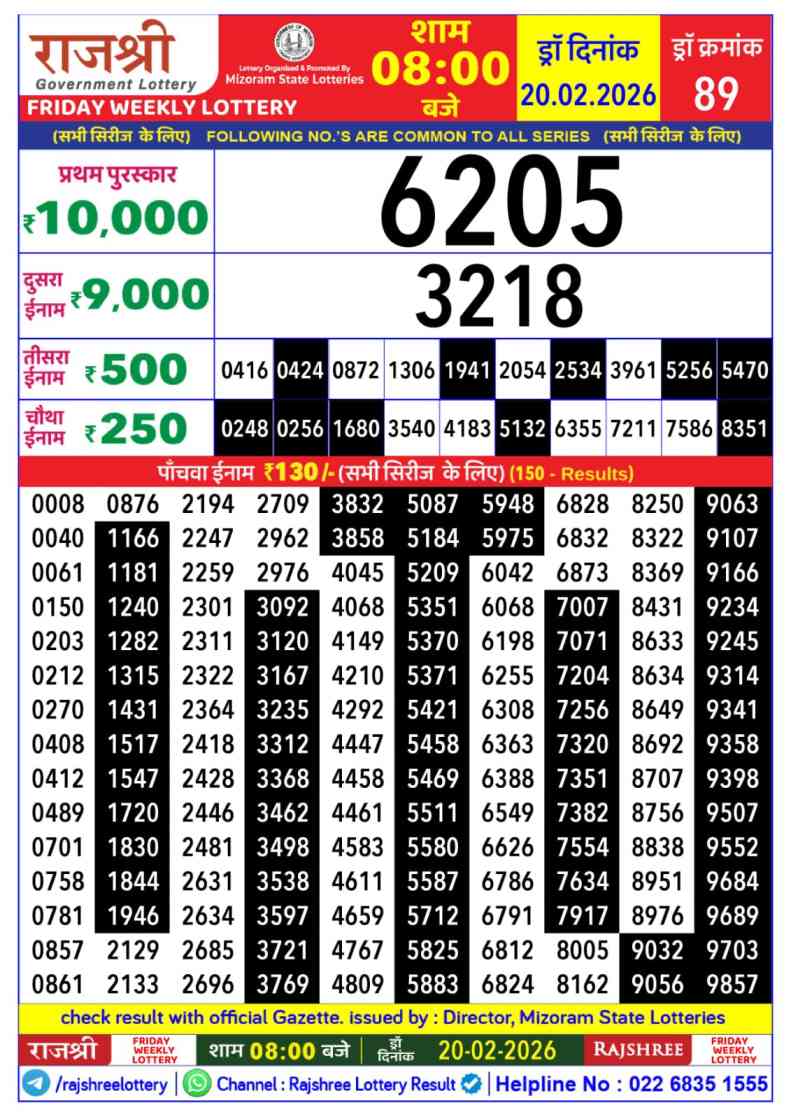 | Mizoram Rajshree Friday Weekly Lottery Result Today Live 20.2.2026 | |