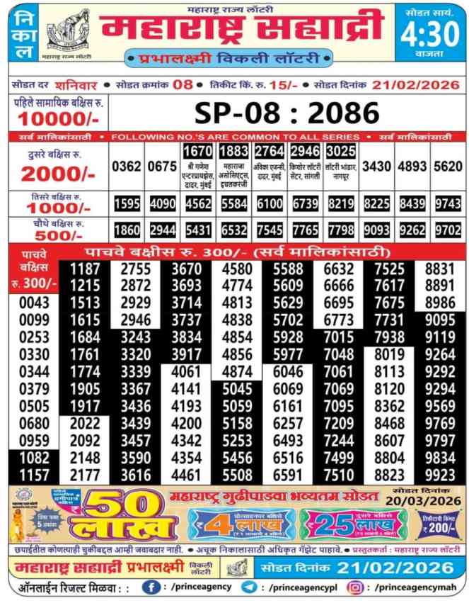 Maharashtra State Lottery declares many bumper results. Sahyadri Prabhalaxmi Weekly Lottery Result 2026 is Maharashtra State Lottery at 04:30 PM whose result gets published on the page around 05:30 PM. Maharashtra State Lottery Result ,21.2.2026 Sahyadri Prabhalaxmi Weekly Result, Sahyadri Prabhalaxmi Result Today Live 4:30PM, Maharashtra Sahyadri Prabhalaxmi Weekly Result 4:30PM, Maharashtra State Sahyadri Prabhalaxmi Weekly Result, Maharashtra State lottery result 4:30PM, Sahyadri Prabhalaxmi Weekly Result, Sahyadri Prabhalaxmi Weekly result, Maharashtra Prabhalaxmi Lottery Result Today 4:30PM, Sahyadri Prabhalaxmi Lottery 4:30 pm result 21.2.2026, Maharashtra Sahyadri Prabhalaxmi Weekly Lottery Result, Sahyadri Prabhalaxmi Live Draw.