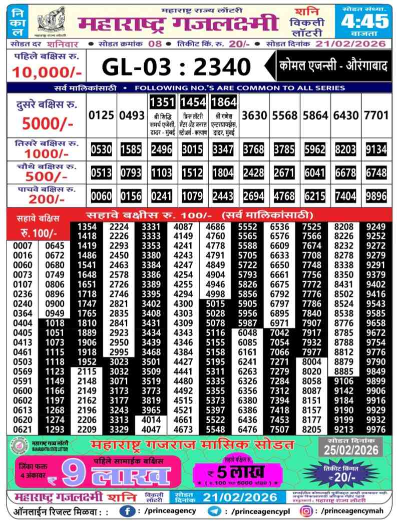 Maharashtra State Lottery declares many bumper results. Gajlaxmi Shani Weekly Lottery Result 2026 is Maharashtra State Lottery at 04:45 PM whose result gets published on the page around 05:30 PM. Maharashtra State Lottery Result ,21.2.2026 Gajlaxmi Shani Weekly Result, Gajlaxmi Shani Result Today Live 4:45PM, Maharashtra Gajlaxmi Shani Weekly Result 4:45PM, Maharashtra State Gajlaxmi Shani Weekly Result, Maharashtra State lottery result 4:45PM, Gajlaxmi Shani Weekly Result, Gajlaxmi Shani Weekly result, Maharashtra lottery result today 4:45PM, Gajlaxmi Shani Lottery 4:45 PM result 21.2.2026, Maharashtra Gajlaxmi Shani Weekly Lottery Result, Maharashtra Gajlaxmi Shani Live Draw.