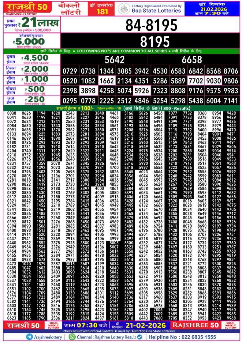 Download Goa Rajshree Lottery 50 Shani 21.2.2026 Today 7:30pm Result from here. Goa Rajshree 50 Weekly Lottery Result Important Lottery of Goa Rajshree which is legally operated by the Rajshree Government there. You are satisfied to Get The Result of 50 Shani weekly Lottery at 07:30pm on this webpost Today’s Lottery Result of Goa Rajshree Lottery 7:30pm is published here.