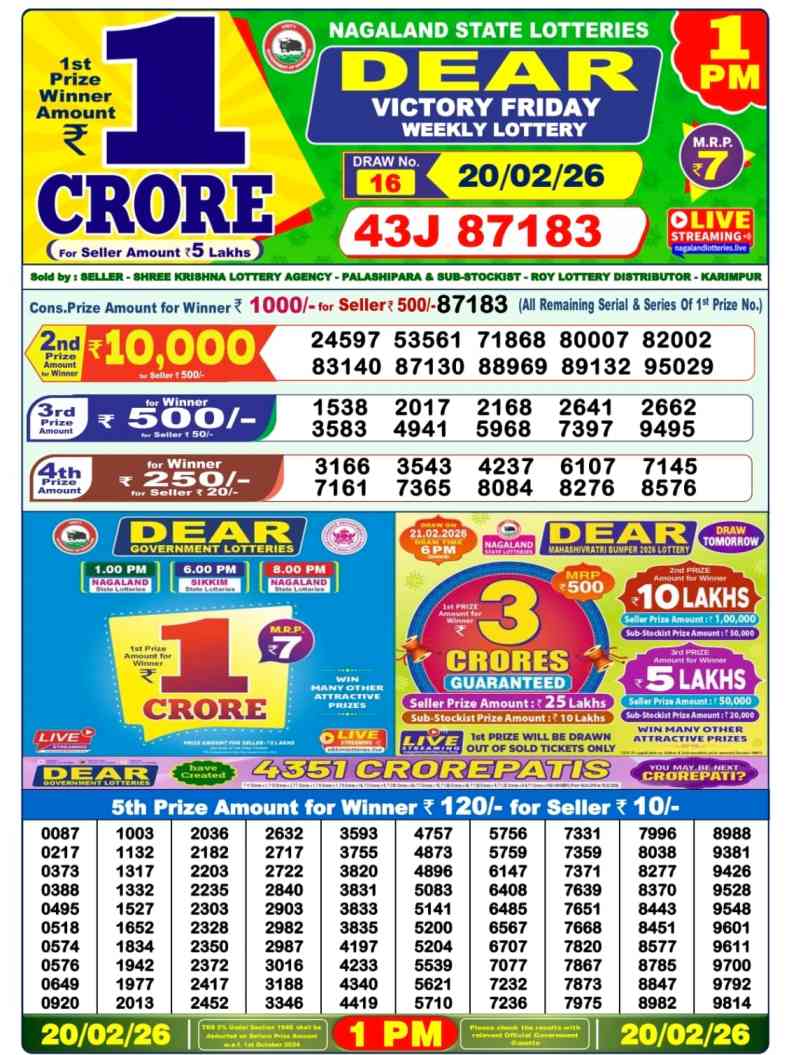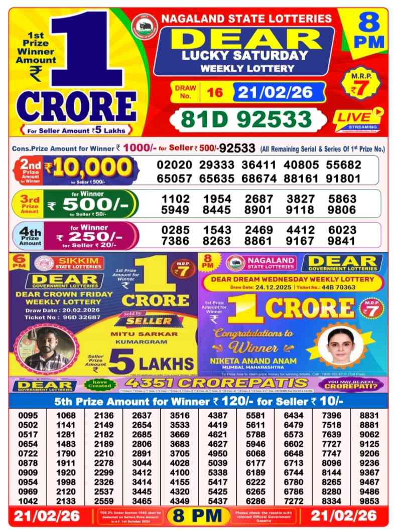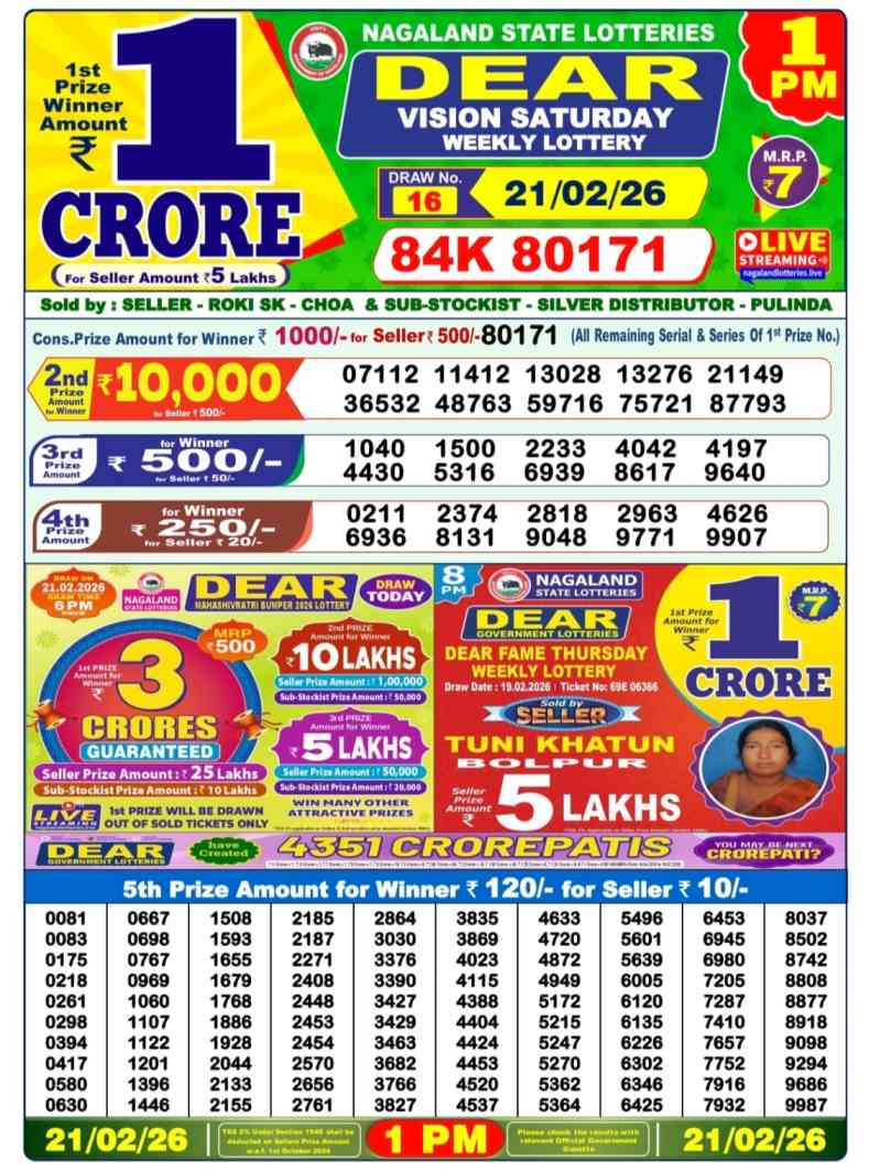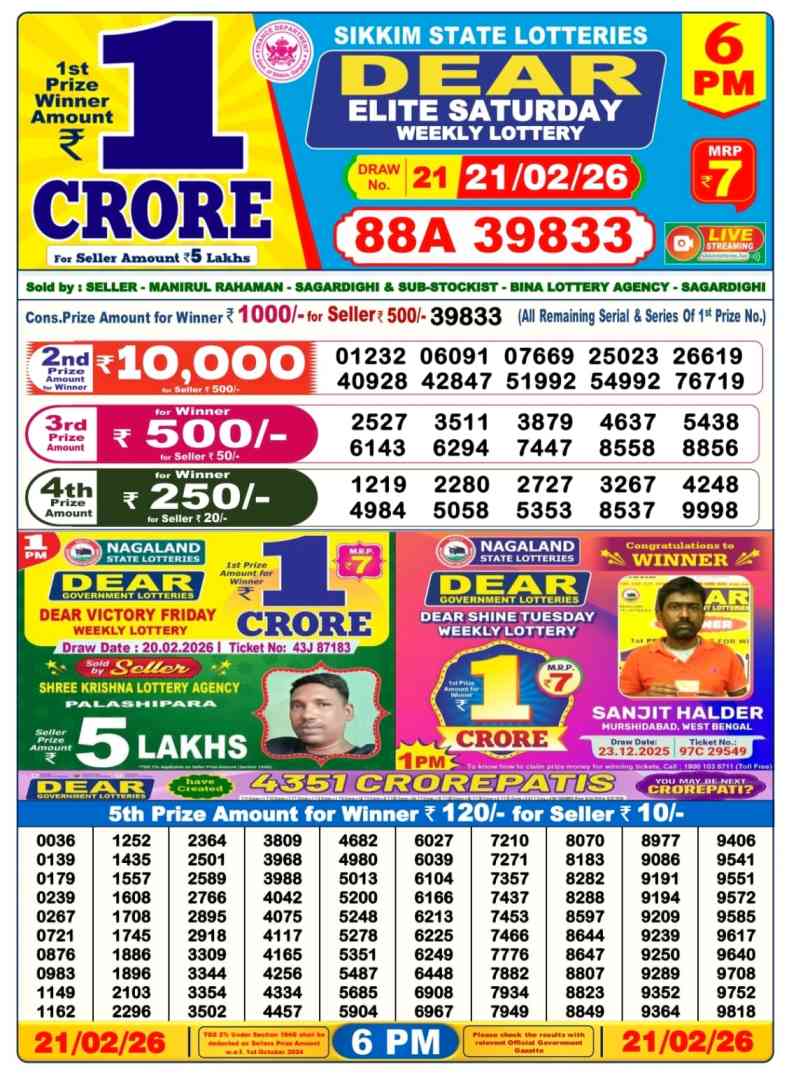 Nagaland State Lotteries Today Live draw Lottery Sambad Lottery Result 6pm. Dear Lottery Result will be presented today at 6pm on Lottery Sambad. Which is combined through West Bengal State Lottery. Lottery Sambad 21.2.2026 Lottery Result, Lottery Sambad 21.2.2026 Eveving Result 6pm, Dear Evening Lottery Sambad Result 21.2.2026. Dear Lottery Result 21.2.2026, Nagaland State Lottery Sambad Result Today 6pm, Today Live Lottery Sambad 21.2.2026, Lottery Sambad Live Today Result, Dear Sikkim State Lottery Evening Result, Sikkim Lottery Sambad Result 21.2.2026, Sikkim State Lottery 6pm Result Today Live.