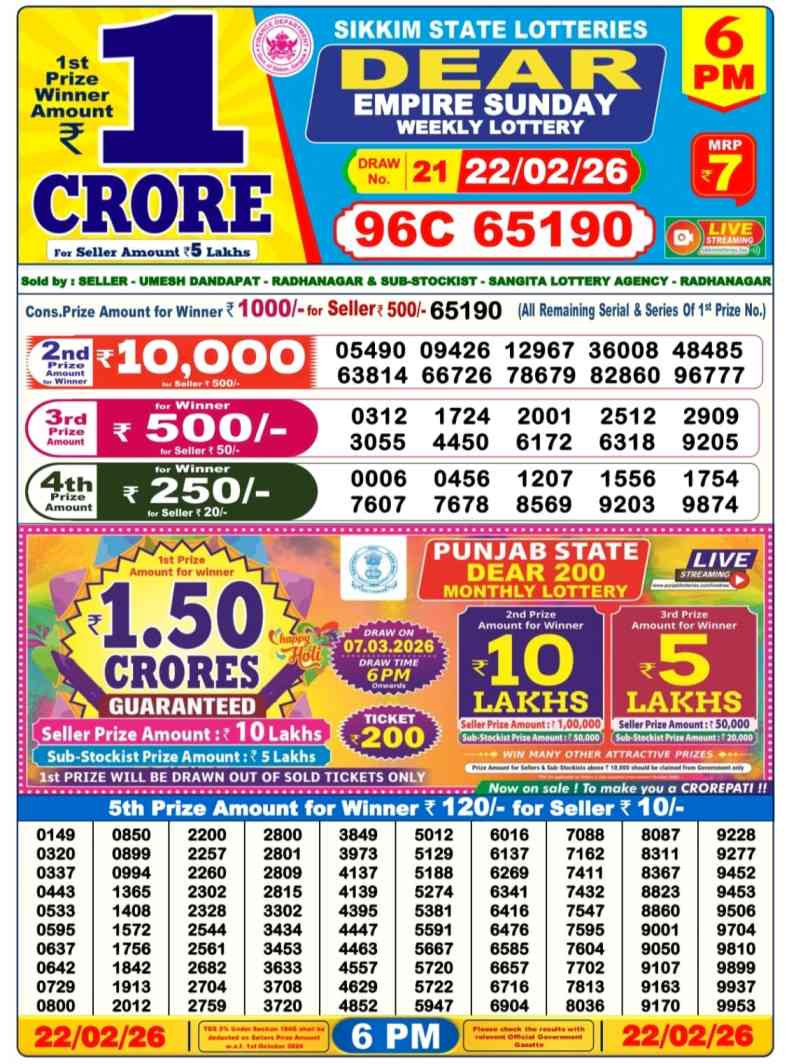 Are you ready to see the Sikkim State Lottery Result then the Sikkim State Lottery Result 22.2.2026 organized by the Sikkim State Government is declared at 1pm, 6pm, 8pm.Here Sikkim State Lottery live result, Dear Lottery Sambad live 22 February 2026, Dear Lottery Sambad Morning 22 2 26, Dear Sikkim State Lottery Sambad 22.2.2026, Lottery Sambad Night 22 February 2026 Draw takes place. Which you can see today’s first winner lottery number in the form of a jpg image.