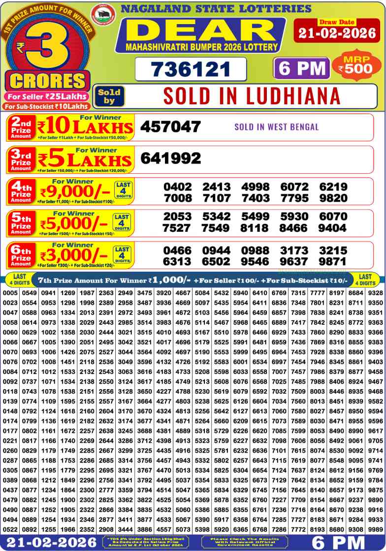 | Nagaland Dear Mahashivratri Bumper Lottery Result Today Live 21.2.2026 | |