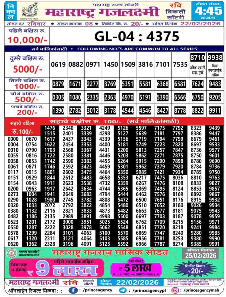 Maharashtra State Lottery 22.2.2026 Today Result is Maharashtra State Gajlaxmi Ravi Weekly Weekly lottery Result draw whose Maharashtra lottery result is published a day. Mainly Maharashtra State Lottery is 4:45 pm Maharashtra State Lottery but being combined with lottery sambad, Maharashtra State Lottery will release the results of 04:45pm is published.