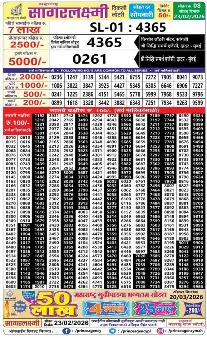 Download Maharashtra State Lottery 23.2.2026 Today 4:15pm Result from here. Maharashtra State Sagar Laxmi Weekly Lottery Result Important Lottery of Maharashtra State which is legally operated by the State Government there. You are satisfied to get the Result of Maharashtra Sagar Laxmi Lottery Draw at 04:15pm on this webpost Today’s lottery result of Maharashtra State Lottery 4:15pm is published here.