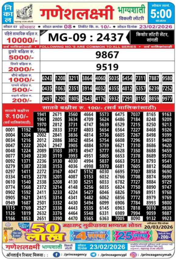 Maharashtra State Lottery declares many bumper results. Ganeshlaxmi Bhagyashali Weekly Lottery Result 2025 is Maharashtra State Lottery at 5:00 PM whose result gets published on the page around 05:30 PM. Maharashtra State Lottery Result ,23.2.2026 Ganeshlaxmi Bhagyashali Weekly Result, Ganeshlaxmi Bhagyashali Result Today Live 05:00PM, Maharashtra Ganeshlaxmi Bhagyashali Weekly Result 05:00PM, Maharashtra State Ganeshlaxmi Bhagyashali Weekly Result, Maharashtra State lottery result 05:00PM, Ganeshlaxmi Bhagyashali Weekly Result, Ganeshlaxmi Bhagyashali Weekly result, Maharashtra Ganeshlaxmi Bhagyashali Lottery Result Today 05:00PM, Ganeshlaxmi Bhagyashali Lottery 05:00 PM result 23.2.2026, Maharashtra Ganeshlaxmi Bhagyashali Weekly Lottery Result, Ganeshlaxmi Bhagyashali Live Draw.