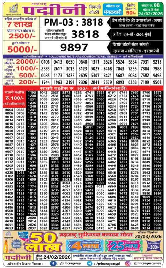 Maharashtra State Lottery declares many bumper results. Maharashtra Padmini 2026 Result is Maharashtra State Lottery at 04:15 PM whose result gets published on the page around 05:00 PM. Maharashtra State Padmini Weekly Lottery Result 24.2.2026 Live Draw Winner List at 4.15 PM, Maharashtra Dear Padmini Lottery 2026, Today Maharashtra Padmini Lottery, Maharashtra State Lottery Padmini Lottery Result Today Live, Maharashtra Padmini Draw 2026, Maharashtra Lottery Padmini Result 2026, Maharashtra Lottery 2026, Maharashtra State Lottery Result 2026, Maharashtra Padmini Lottery 24.2.2026 Result.