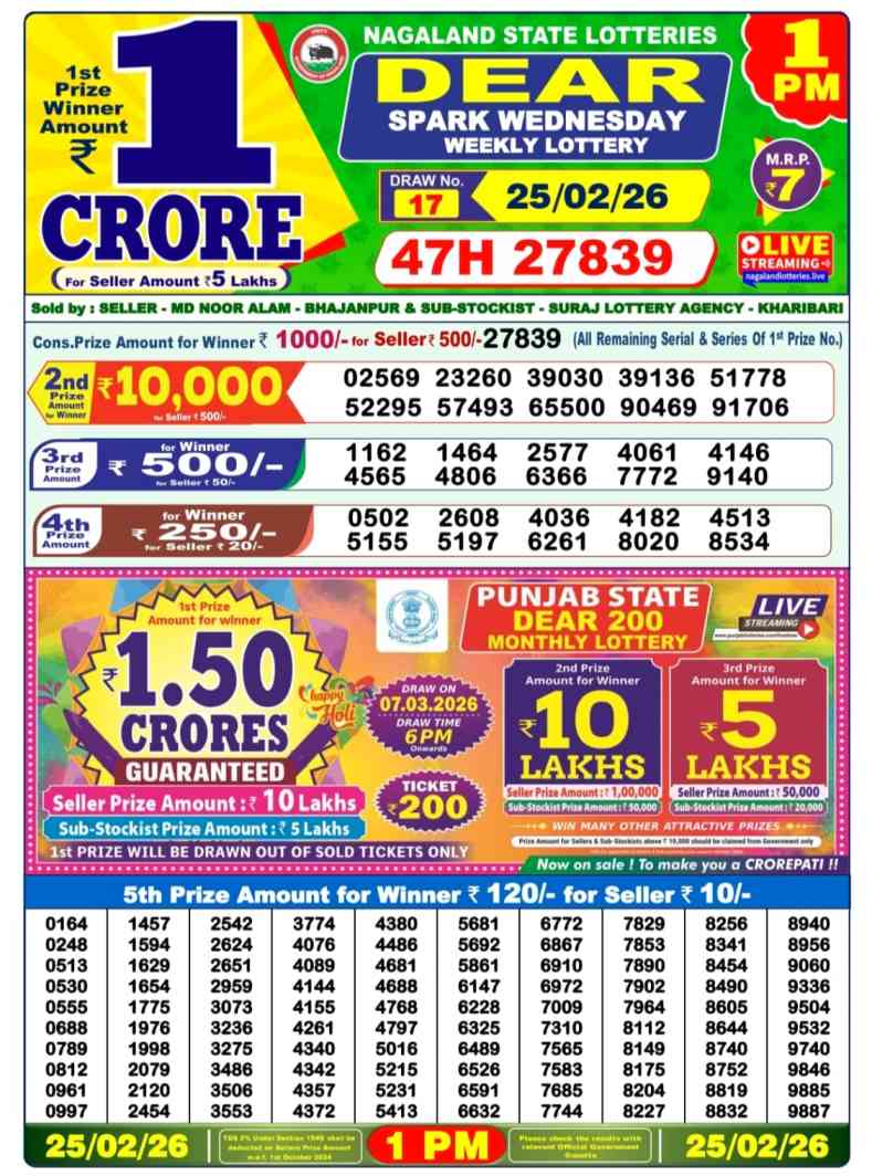 As the Lottery Sambad Morning 1pm Result is weekly, today Dear Lottery Sambad Morning Result will be released at 1pm which is known as Nagaland State Lotteries Dear Morning Weekly Lottery Result. Lottery Sambad 25.2.2026 Result, Nagaland Lottery Sambad 25.2.2026 Today Result, Dear Lottery Result, Dear Lottery Result 25.2.2026, Dear Lottery Sambad Morning Result 25.2.2026, Dear Morning Result Today 1pm, Lottery Sambad Today Live 1pm, Nagaland State Lottery Sambad Result Today 1 PM, 6 PM, 8 PM Nagaland Lottery Sambad Result 25.2.2026, Nagaland Lottery 25.2.2026 Result, Nagaland State Lottery Morning 25.2.2026 Result, Nagaland Lottery Result 1 pm, Nagaland State Lottery Result Today 25.2.2026, Nagaland State Lottery Result Today, Dear Day Lottery Sambad Result, Lottery Sambad Day Result, Nagaland State Lottery 25.2.2026, Nagaland Lottery Result, Lottery Sambad Today Result.
