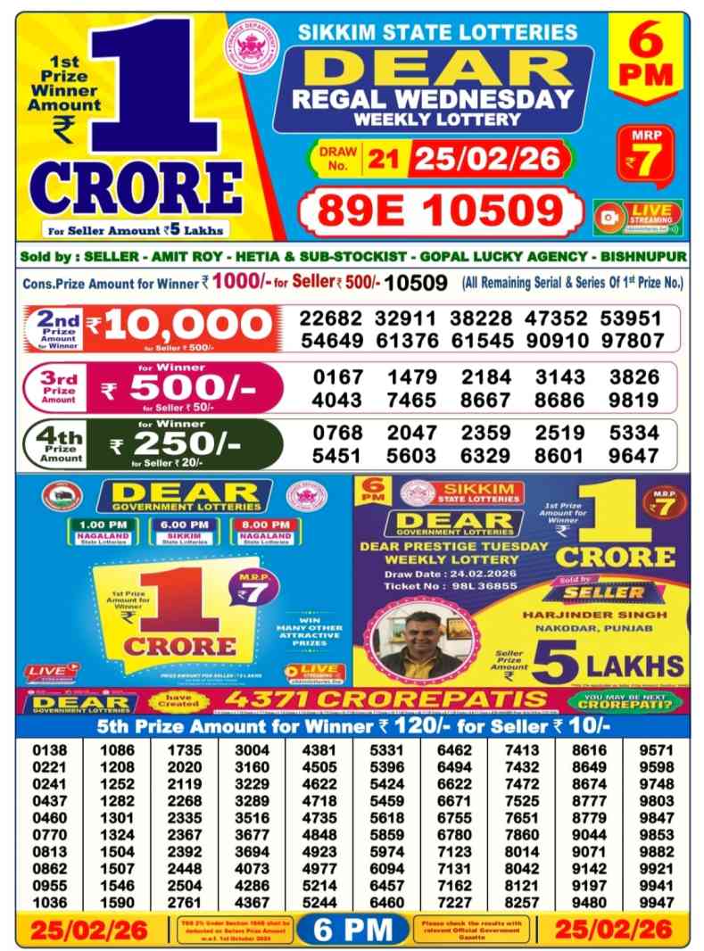 Nagaland State Lotteries Today Live draw Lottery Sambad Lottery Result 6pm. Dear Lottery Result will be presented today at 6pm on Lottery Sambad. Which is combined through West Bengal State Lottery. Lottery Sambad 25.2.2026 Lottery Result, Lottery Sambad 25.2.2026 Eveving Result 6pm, Dear Evening Lottery Sambad Result 25.2.2026. Dear Lottery Result 25.2.2026, Nagaland State Lottery Sambad Result Today 6pm, Today Live Lottery Sambad 25.2.2026, Lottery Sambad Live Today Result, Dear Sikkim State Lottery Evening Result, Sikkim Lottery Sambad Result 25.2.2026, Sikkim State Lottery 6pm Result Today Live.