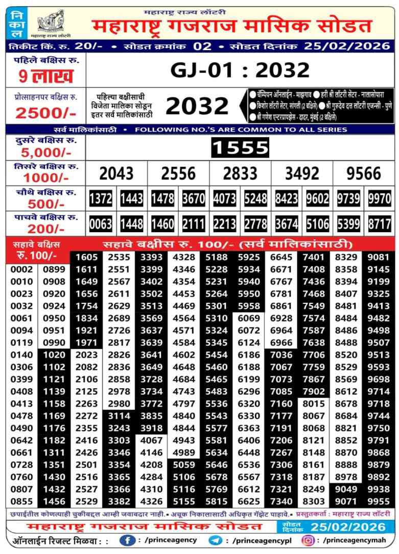 Maharashtra State Gajraj Monthly lottery ticket is only 100 rupees for 1 ticket, but 09 Lakh is given as prize for winning the major. Results are also placed on this page which you can see Maharashtra Gajraj Monthly Result Today 25.2.2026 is searched by different names, Maharashtra State Gajraj Monthly 2026, Maharashtra Gajraj Monthly Lottery Result 2026, Maharashtra Ganesh Laxmi Dasara Monthly Result, Maharashtra Gajraj Monthly Lottery Result 25.2.2026 Live Result 4:00 PM, Maharashtra Special Monthly Lottery Result 25.2.2026, Dear Maharashtra Gajraj Monthly PDF Result, Today Live Maharashtra Gajraj Monthly Lottery Result, Maharashtra State Gajraj Monthly 2026 Draw, Maharashtra State Gajraj Monthly 2026 Result. Maharashtra Gajraj Monthly Result, Maharashtra State Ganesh Gajraj Monthly Result, Maharashtra Gajraj Monthly Lottery Result, Maharashtra State Lottery Gajraj Monthly Sodat Result.
