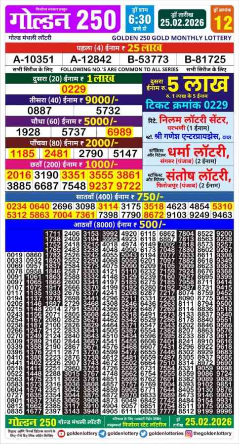 Mizoram State Lottery declares many bumper results. Mizoram Golden 250 Gold Monthly Result 25.2.2026 is Mizoram State Lottery at 07:30 PM whose result gets published on the page around 07:30 PM. Mizoram State Lottery Result , 25.2.2026 Golden 250 Gold Monthly Result, Mizoram Golden 250 Gold Monthly Result, Golden 250 Gold Monthly Lottery Result 7:30PM, Golden 250 Gold Monthly Result, Mizoram Golden 250 Gold Monthly Result 7:30PM, Mizoram State Lottery Result Today Golden 250 Gold Monthly Result 7:30PM, Mizoram 250 Gold Monthly Lottery Result 25.2.2026.