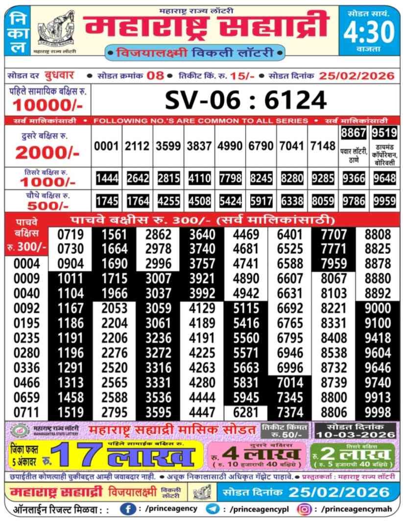 Maharashtra State Lottery 25.2.2026 Today Result is Maharashtra State Sahyadri Mahalaxmi Weekly Weekly lottery Result draw whose Maharashtra lottery result is published a day. Mainly Maharashtra State Lottery is 4:30 pm Maharashtra State Lottery but being combined with lottery sambad, Maharashtra State Lottery will release the results of 04:30PM is published.