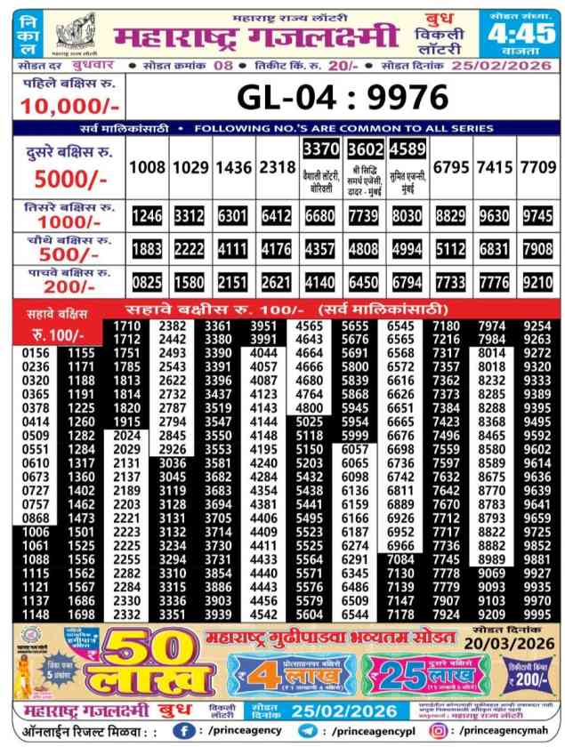 Maharashtra Gajlaxmi Budh Weekly Lottery Result Today Latest Update on 25 February 2026 : -Maharashtra State Lottery’s Gajlaxmi Budh Weekly Weekly Lottery Results have been declared today on Maharashtra Gajlaxmi Budh Weekly 4:45PM.
