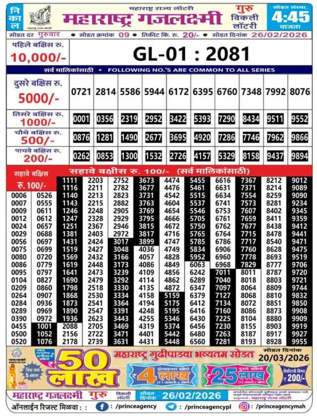 Maharashtra State Lottery 26.2.2026 Today Result is Maharashtra State Gajlaxmi Guru Weekly Weekly lottery Result draw whose Maharashtra lottery result is published a day. Mainly Maharashtra State Lottery is 4:45 pm Maharashtra State Lottery but being combined with lottery sambad, Maharashtra State Lottery will release the results of 04:45pm is published.