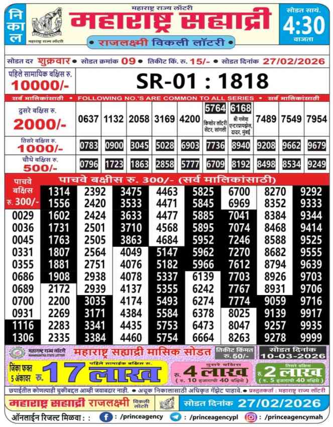 Maharashtra State Sahyadri Rajlaxmi Weekly Lottery ticket is only Maharashtra Sahyadri Weekly rupees 15 for 1 ticket, but 10 thousand is given as prize for winning the major. Results are also placed on this page which you can see Sahyadri Rajlaxmi Weekly Lottery Result today 27.2.2026 is searched by different names, Maharashtra State Sahyadri Rajlaxmi Weekly Lottery Result 4:30PM, Maharashtra State lottery 4:30PM result , Maharashtra State Lottery today Sahyadri Rajlaxmi Weekly lottery result, Maharashtra Sahyadri Rajlaxmi Lottery Result, Maharashtra State Sahyadri Rajlaxmi Weekly lottery result 2026, Sahyadri Rajlaxmi Weekly lottery result 4:30PM, Maharashtra State lottery 2026.