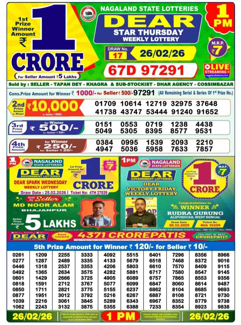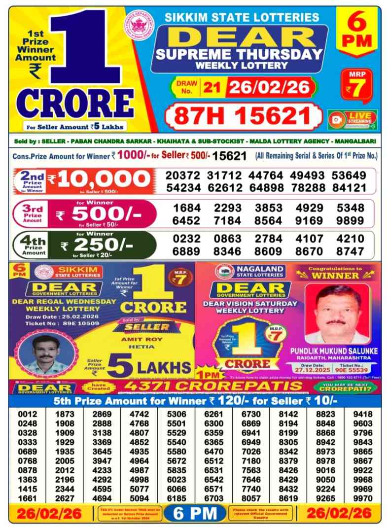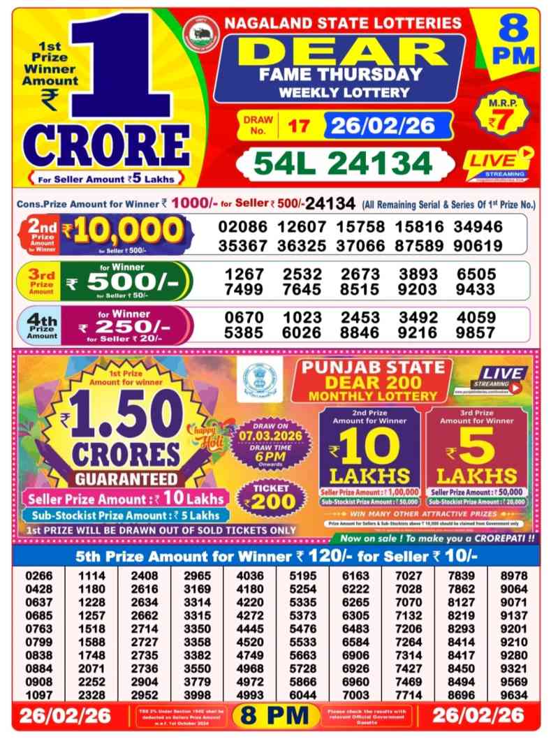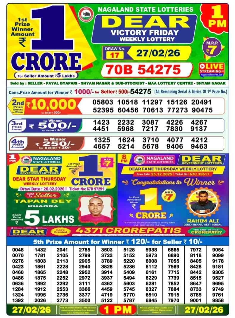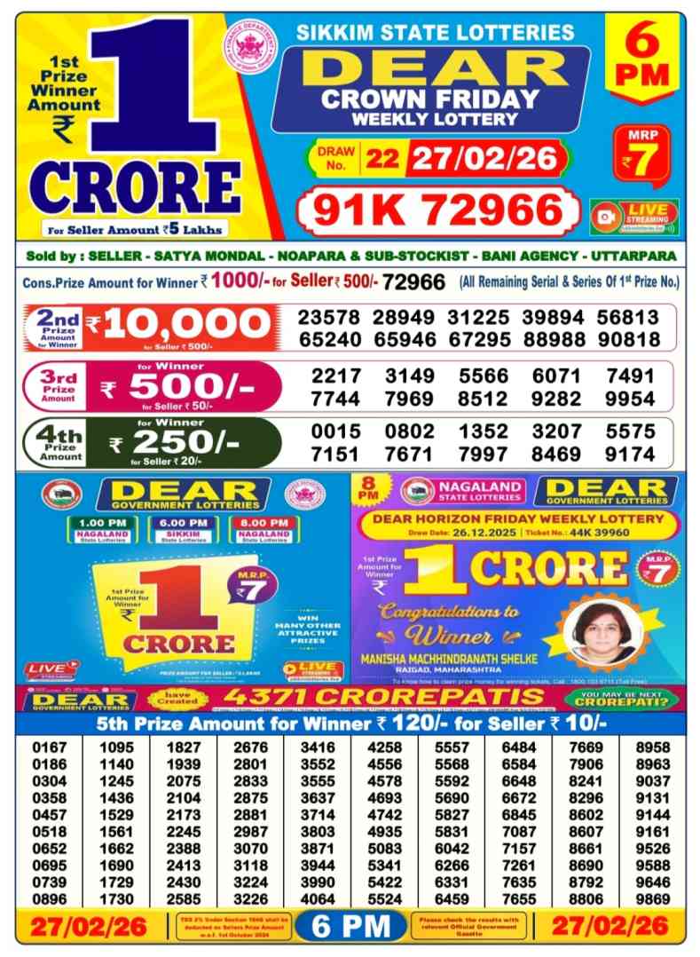 Nagaland State Lotteries Today Live draw Lottery Sambad Lottery Result 6pm. Dear Lottery Result will be presented today at 6pm on Lottery Sambad. Which is combined through West Bengal State Lottery. Lottery Sambad 27.2.2026 Lottery Result, Lottery Sambad 27.2.2026 Eveving Result 6pm, Dear Evening Lottery Sambad Result 27.2.2026. Dear Lottery Result 27.2.2026, Nagaland State Lottery Sambad Result Today 6pm, Today Live Lottery Sambad 27.2.2026, Lottery Sambad Live Today Result, Dear Sikkim State Lottery Evening Result, Sikkim Lottery Sambad Result 27.2.2026, Sikkim State Lottery 6pm Result Today Live.
