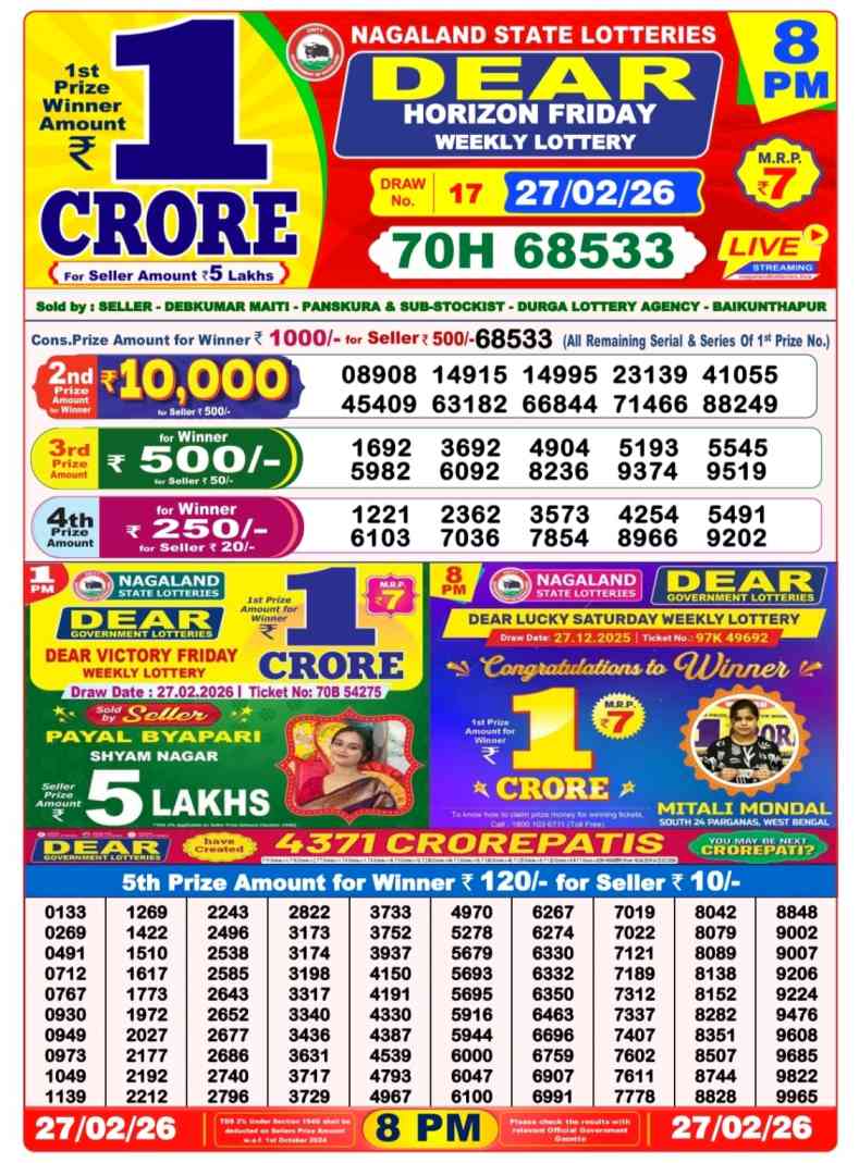 Lottery Sambad 27.2.2026 Result Today Live:-