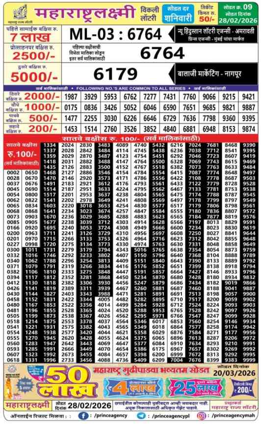 Maharashtra Laxmi WeeklyLottery Announced on 28.2.2026. Winner list Announcement by Maharashtra State Lotteries Board.