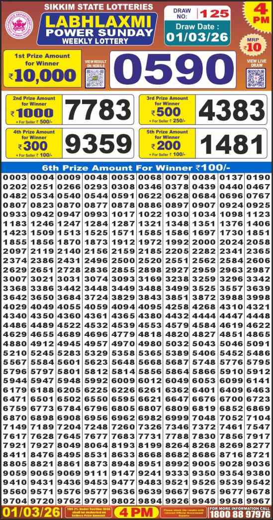 Sikkim State Labh laxmi Power Sunday Lottery ticket is only Labh laxmi Power rupees for 1 ticket, but 10,000 is given as prize for winning the major. Results are also placed on this page which you can see Labh laxmi Power Sunday Lottery Result today 1.3.2026 is searched by different names, Sikkim State Labh laxmi Power Lottery Result 4PM, Sikkim State lottery 4PM result , Sikkim State Lottery today Labh laxmi Power lottery result, Sikkim Labh laxmi Sunday Lottery Result, Sikkim State Labh laxmi Power Sunday lottery result 2026, Labh laxmi Power lottery result 4PM, Sikkim State lottery 2026.
