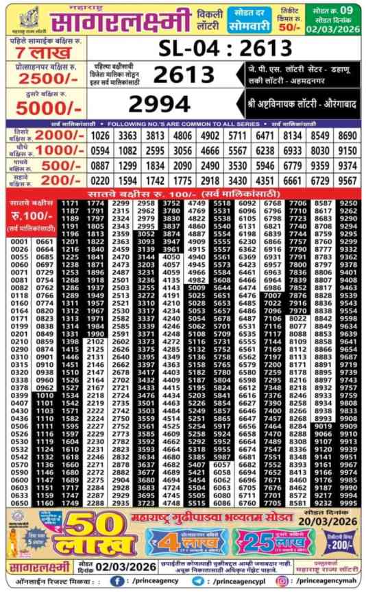 Maharashtra State Sagar Laxmi lottery ticket is only 50 rupees for 1 ticket, but 8 Lakh Rupees is given as prize for winning the major. Results are also placed on this page which you can see Maharashtra Sagar Laxmir Result Today 2.3.2026 is searched by different names, Maharashtra State Sagar Laxmi Weekly 2026, Maharashtra Sagar Laxmi Weekly Lottery Result 2026, Maharashtra Sagar Laxmi Lottery Result 2.3.2026 Live Result 4:15 PM, Maharashtra Sagar Laxmi Lottery Result 2.3.2026, Dear Maharashtra Sagar Laxmi PDF Result, Today Live Maharashtra Sagar Laxmi Weekly Lottery Result, Maharashtra State Sagar Laxmi Weekly 2026 Draw, Maharashtra State Sagar Laxmi Weekly 2026 Result.