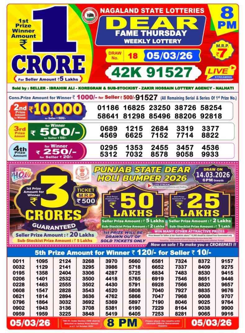 Nagaland lottery ticket is only 7 rupees but 1 crore is given as prize for winning the major. Results are also placed on this page which you can see. Nagaland lottery sambad is searched by different names, lottery sambad 8pm result, lottery sambad night result, night result 8pm, nagaland state lottery 8pm result, nagaland state lottery sambad 8pm Result, Nagaland State Lotteries, Nagaland State Lottery Result 8pm, 6pm, 1pm, Nagaland State Lottery Live, Nagaland Lotteries, Nagaland State Lottery Evening Result, Nagaland State Lottery Old Result, Lottery Sambad Old, Nagaland Lottery Sambad Night Result Live 8PM, Nagaland Lottery Sambad Result Live 6PM, Nagaland State Lottery Sambad Morning Result Live 1PM.