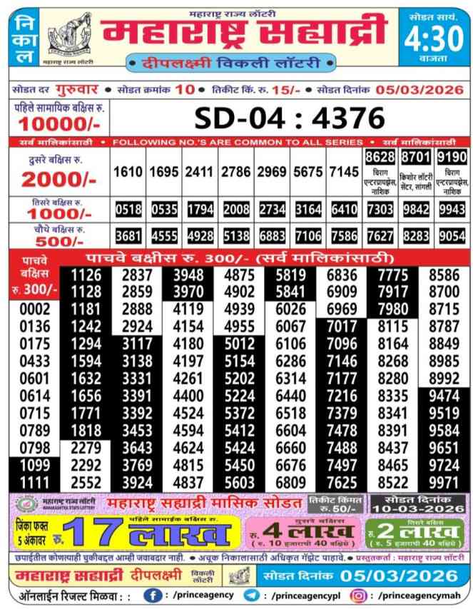 | Maharashtra State Sahyadri Deeplaxmi Weekly Lottery 5.3.2026 Result | Maharashtra State Lottery 4:30pm Result | Maharashtra State Sahyadri Deeplaxmi Weekly Lottery Result Today 04:30pm| Maharashtra State Lottery Result 04:30pm Today Live Draw | Maharashtra State Lottery | Check Maharashtra Sahyadri Deeplaxmi Weekly Weekly Lottery Result | |