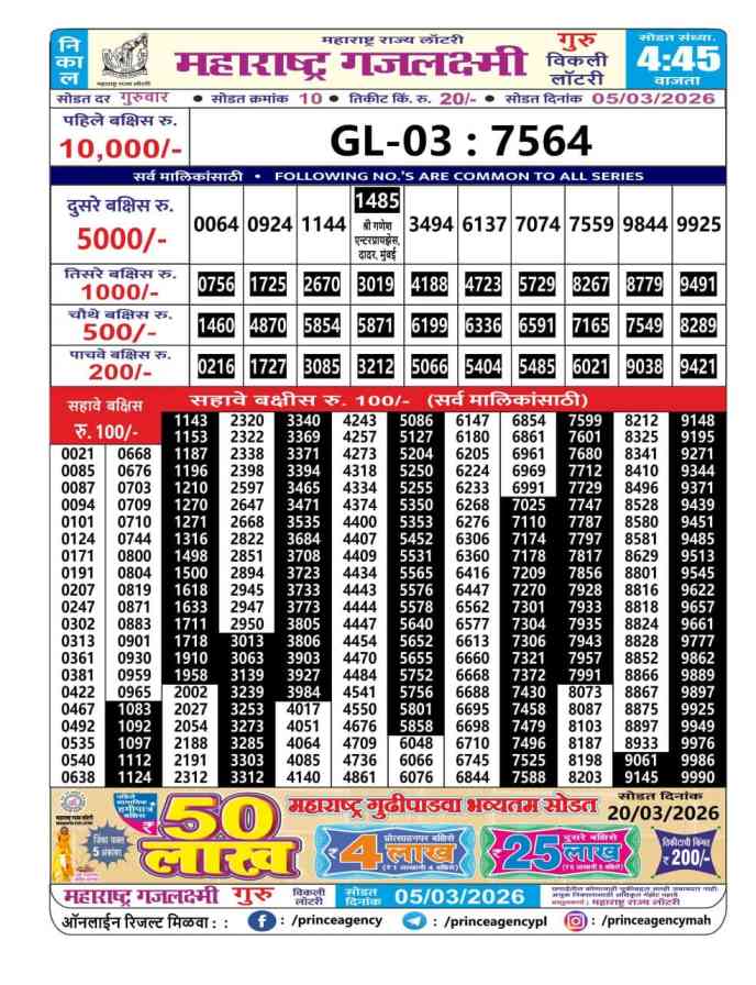 Maharashtra State Gajlaxmi Guru Weekly Lottery ticket is only Guru Weekly rupees for 1 ticket, but 1 Lakh is given as prize for winning the major. Results are also placed on this page which you can see Gajlaxmi Guru Weekly Lottery Result today 5.3.2026 is searched by different names, Maharashtra State Gajlaxmi Guru Weekly Lottery Result 4:45pm, Maharashtra State lottery 4:45pm result , Maharashtra State Lottery today Gajlaxmi Guru Weekly lottery result, Maharashtra Gajlaxmi Guru Lottery Result, Maharashtra State Gajlaxmi Guru Weekly lottery result 2026, Gajlaxmi Guru Weekly lottery result 4:45pm, Maharashtra State lottery 2026.