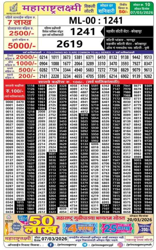 Maharashtra Laxmi WeeklyLottery Announced on 7.3.2026. Winner list Announcement by Maharashtra State Lotteries Board.
