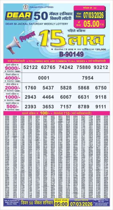 Punjab State Lottery 7.3.2026 Today Result is Punjab State Dear 50 Jackal Saturday Weekly lottery Result draw whose Punjab lottery result is published a day. Mainly Punjab State Lottery is 6:00 pm Punjab State Lottery but being combined with lottery sambad, Punjab State Lottery will release the results of 06:00pm is published.