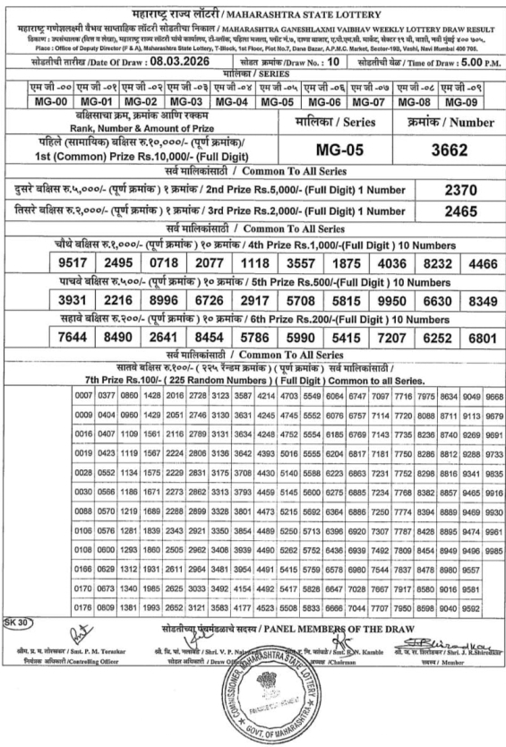 Maharashtra State Lottery 8.3.2026 Today Result is Maharashtra State Ganeshlaxmi Vaibhav Weekly Weekly lottery Result draw whose Maharashtra lottery result is published a day. Mainly Maharashtra State Lottery is 05:00 pm Maharashtra State Lottery but being combined with lottery sambad, Maharashtra State Lottery will release the results of 5:00pm is published.
