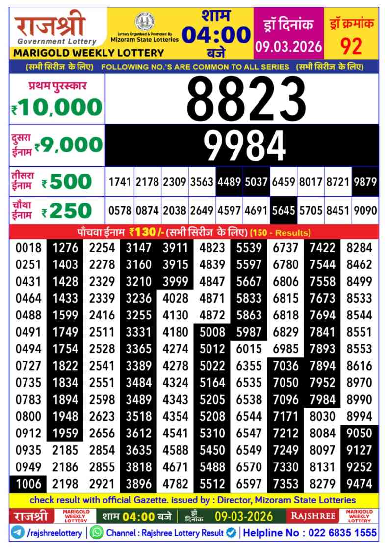 Goa Rajshree Lottery declares many bumper results. Today Rajshree Marigold Lottery Result 2026 is Goa Rajshree Lottery at 03:30 PM whose result gets published on the page around 04:12 PM. Goa Rajshree Lottery Result ,9.3.2026 Marigold Som Result, Rajshree Marigold Result Today Live 4:00PM, Goa Rajshree Marigold Som Weekly Result, Goa Rajshree Lottery Result 4:00PM, Goa Marigold Som Result 3:30 PM, Goa Lottery Result Today 4:00PM, Rajshree Marigold Weekly Lottery 3:30 PM Result 9.3.2026.