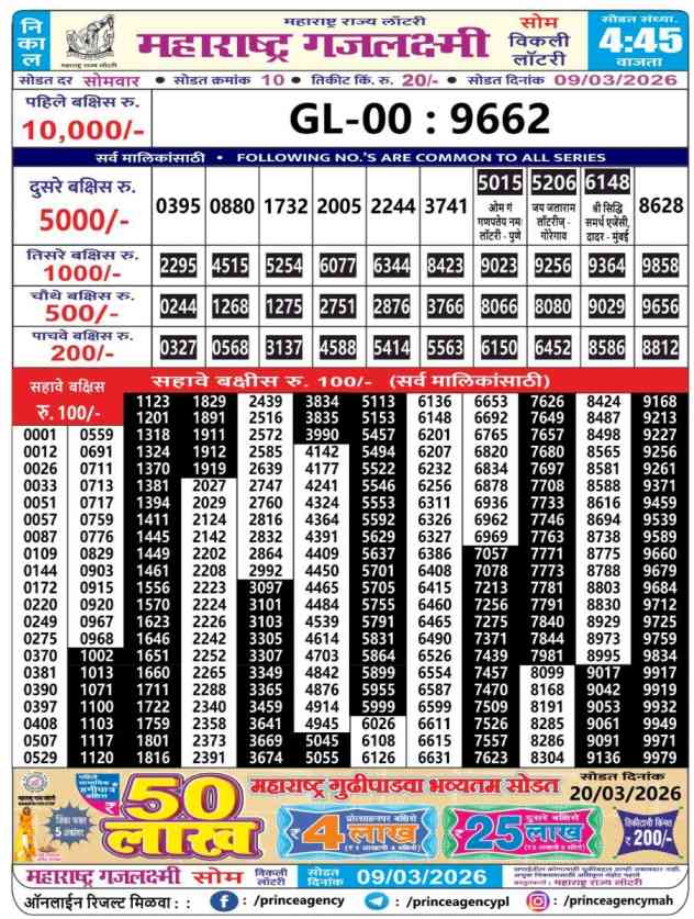 Maharashtra State Gajlaxmi Som Weekly Lottery ticket is only Som Weekly rupees for 1 ticket, but 1 Lakh is given as prize for winning the major. Results are also placed on this page which you can see Gajlaxmi Som Weekly Lottery Result today 9.3.2026 is searched by different names, Maharashtra State Gajlaxmi Som Weekly Lottery Result 4:45pm, Maharashtra State lottery 4:45pm result , Maharashtra State Lottery today Gajlaxmi Som Weekly lottery result, Maharashtra Gajlaxmi Som Lottery Result, Maharashtra State Gajlaxmi Som Weekly lottery result 2026, Gajlaxmi Som Weekly lottery result 4:45pm, Maharashtra State lottery 2026.