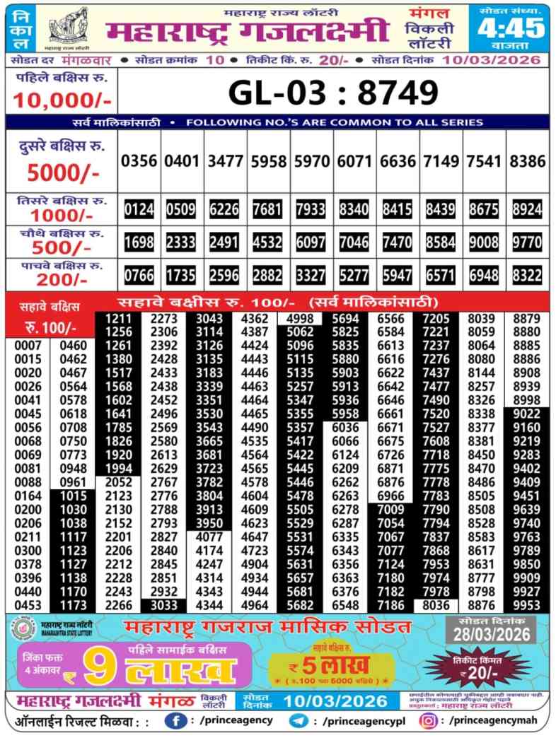 | Maharashtra Gajlaxmi Mangal Weekly Lottery Result Today Live 10.3.2026 | |
