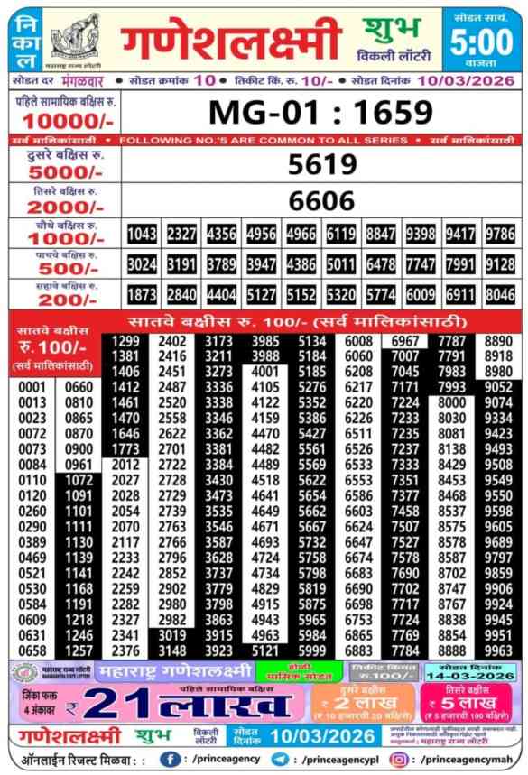 Maharashtra State Ganeshlaxmi Vijayi Weekly Lottery ticket is only Maharashtra Weekly rupees 10 for 1 ticket, but 10 thousand is given as prize for winning the major. Results are also placed on this page which you can see Ganeshlaxmi Vijayi Weekly Lottery Result today 10.3.2026 is searched by different names, Maharashtra State Ganeshlaxmi Vijayi Weekly Lottery Result 05:00pm, Maharashtra State lottery 05:00pm result , Maharashtra State Lottery today Ganeshlaxmi Vijayi Weekly lottery result, Maharashtra Ganeshlaxmi Vijayi Lottery Result, Maharashtra State Ganeshlaxmi Vijayi Weekly lottery result 2026, Ganeshlaxmi Vijayi Weekly lottery result 05:00pm, Maharashtra State lottery 2026.