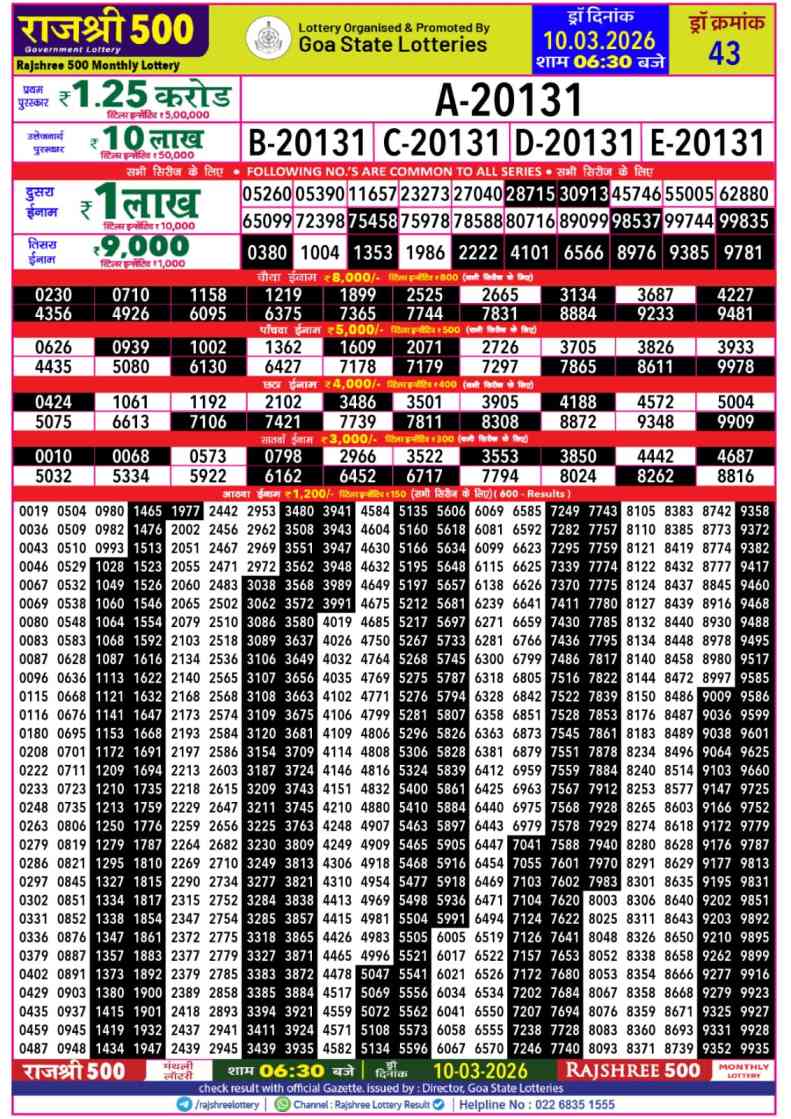 Goa Rajshree 500 Monthly Lottery ticket is only 500 Monthly rupees for 1 ticket, but 1.25 Crore is given as prize for winning the major. Results are also placed on this page which you can see Rajshree 500 Monthly Lottery Result today 10.3.2026 is searched by different names, Goa Rajshree 500 Monthly Lottery Result 6:30pm , Goa Rajshree lottery 5pm result , Goa Rajshree Lottery today 500 Monthly lottery result, Goa Rajshree 500 Lottery Result, Goa Rajshree 500 Monthly Lottery Result 2026, Goa Rajshree 500 Monthly Lottery Result 6:30PM.