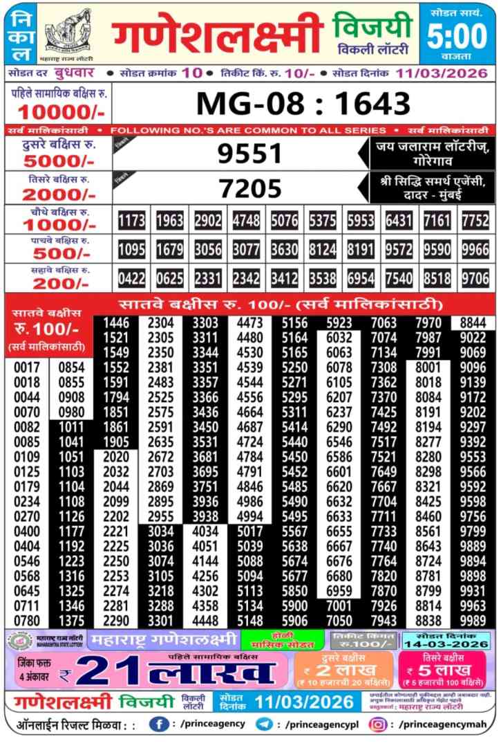 | Maharashtra Mahalaxmi Weekly Lottery Result Today Live 11.3.2026 | |
