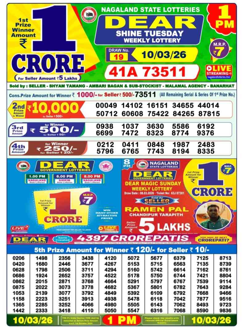 Nagaland lottery ticket is only 7 rupees but 1 crore is given as prize for winning the major. Results are also placed on this page which you can see. Nagaland lottery sambad is searched by different names, lottery sambad 8pm result, lottery sambad night result, night result 8pm, nagaland state lottery 8pm result, nagaland state lottery sambad 8pm Result, Nagaland State Lotteries, Nagaland State Lottery Result 8pm, 6pm, 1pm, Nagaland State Lottery Live, Nagaland Lotteries, Nagaland State Lottery Evening Result, Nagaland State Lottery Old Result, Lottery Sambad Old, Nagaland Lottery Sambad Night Result Live 8PM, Nagaland Lottery Sambad Result Live 6PM, Nagaland State Lottery Sambad Morning Result Live 1PM.