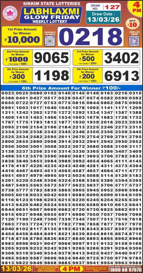 Sikkim State Lottery 13.3.2026 Today Result is Sikkim State Labh laxmi Glow Friday Weekly lottery Result draw whose Sikkim lottery result is published a day. Mainly Sikkim State Lottery is 4:00 pm Sikkim State Lottery but being combined with lottery sambad, Sikkim State Lottery will release the results of 04:00pm is published.
