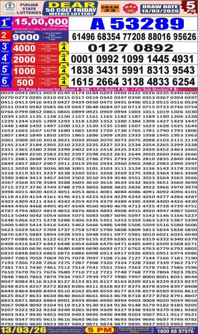 Punjab State Lottery 13.3.2026 Today Result is Punjab State Dear 50 Colt Friday Weekly lottery Result draw whose Punjab lottery result is published a day. Mainly Punjab State Lottery is 6:00 pm Punjab State Lottery but being combined with lottery sambad, Punjab State Lottery will release the results of 06:00pm is published.