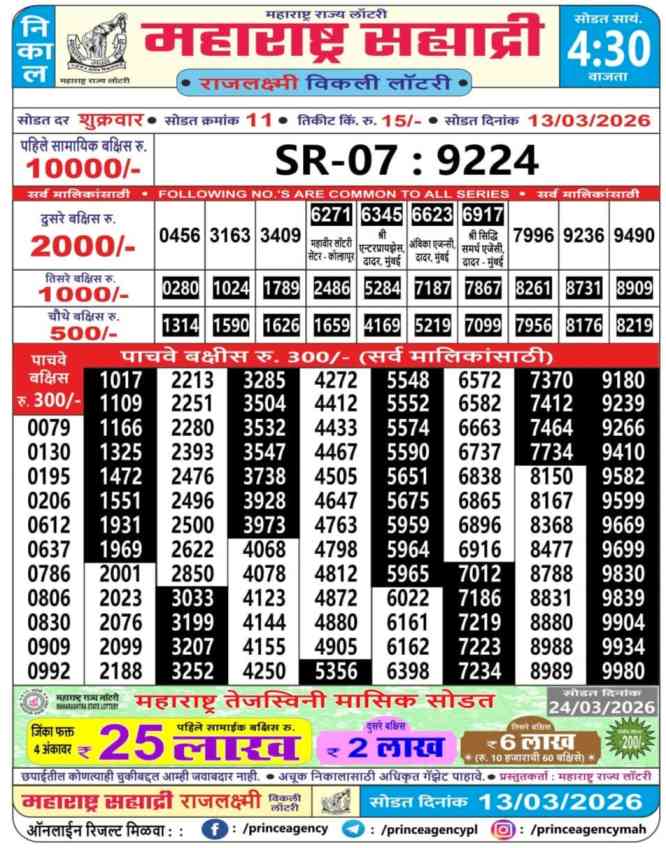 Maharashtra State Lottery 13.3.2026 Today Result is Maharashtra State Sahyadri Rajlaxmi Weekly Weekly lottery Result draw whose Maharashtra lottery result is published a day. Mainly Maharashtra State Lottery is 4:30 pm Maharashtra State Lottery but being combined with lottery sambad, Maharashtra State Lottery will release the results of 04:30PM is published.