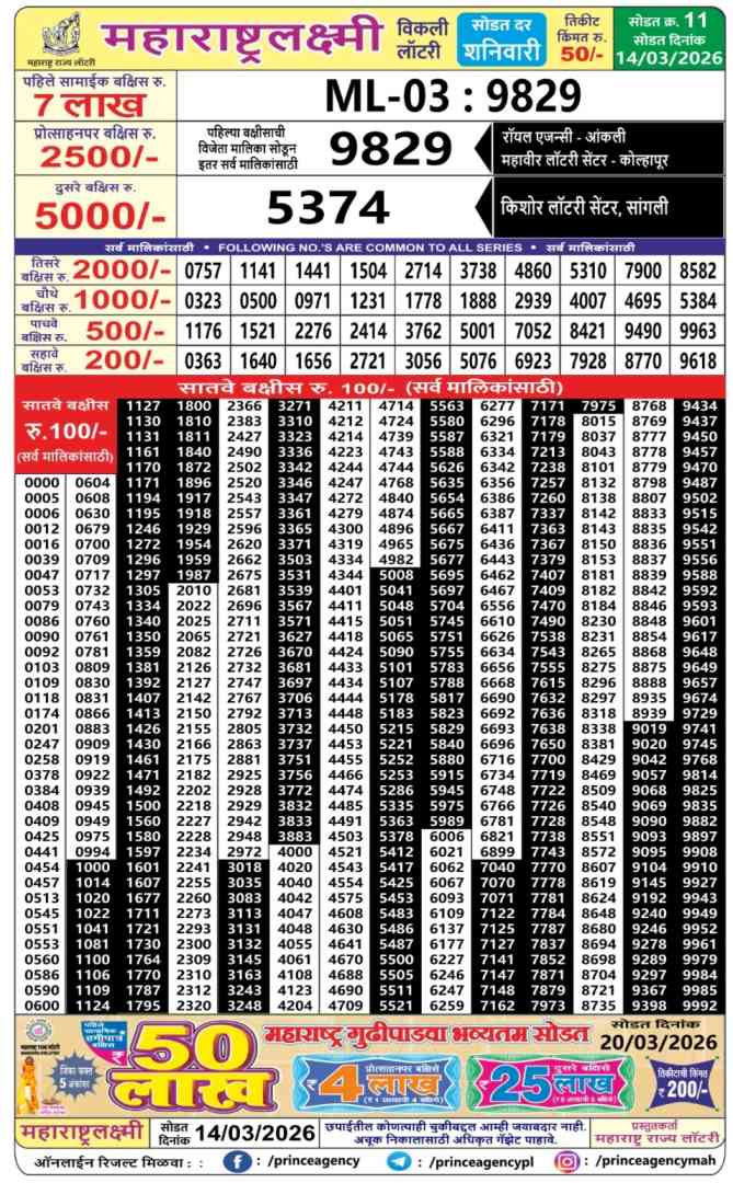 Maharashtra State Lottery 14.3.2026 Today Result is Laxmi Weekly lottery draw whose Maharashtra lottery result is published a day. Mainly Maharashtra State Lottery is 04:15 pm Maharashtra State Lottery but being combined with lottery sambad, Maharashtra State Lottery will release the results of 04:15pm is published.