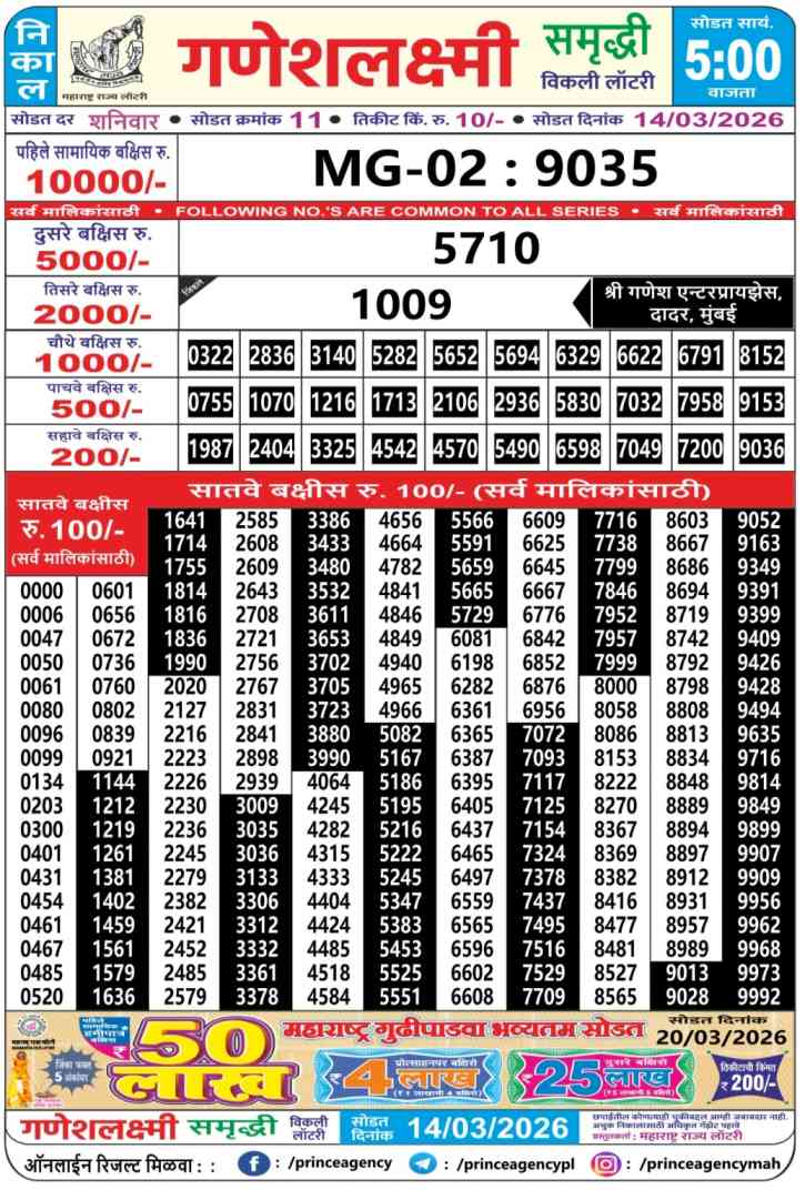 Maharashtra State Lottery declares many bumper results. Ganeshlaxmi Samriddhi Weekly Lottery Result 2026 is Maharashtra State Lottery at 5:00 PM whose result gets published on the page around 05:30 PM. Maharashtra State Lottery Result ,14.3.2026 Ganeshlaxmi Samriddhi Weekly Result, Ganeshlaxmi Samriddhi Result Today Live 05:00PM, Maharashtra Ganeshlaxmi Samriddhi Weekly Result 05:00PM, Maharashtra State Ganeshlaxmi Samriddhi Weekly Result, Maharashtra State lottery result 05:00PM, Ganeshlaxmi Samriddhi Weekly Result, Ganeshlaxmi Samriddhi Weekly result, Maharashtra Ganeshlaxmi Samriddhi Lottery Result Today 05:00PM, Ganeshlaxmi Samriddhi Lottery 05:00 PM result 14.3.2026, Maharashtra Ganeshlaxmi Samriddhi Weekly Lottery Result, Ganeshlaxmi Samriddhi Live Draw.