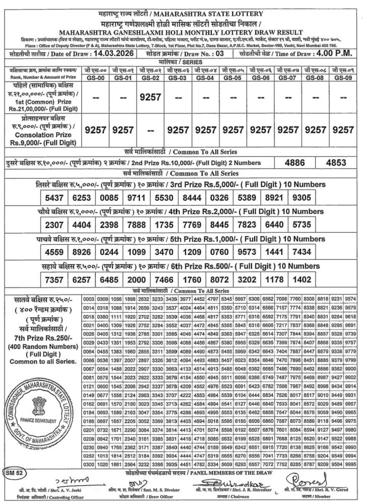Maharashtra State Lottery 14.3.2026 Today Result is weekly lottery draw whose Maharashtra lottery result is published a day. Mainly Maharashtra State Lottery is 4:00 pm Maharashtra State Lottery but being combined with lottery sambad, Maharashtra State Lottery will release the results of 04:00pm is published.Maharashtra State Lottery Ganesh Laxmi Vishesh Masik Sodat Result.